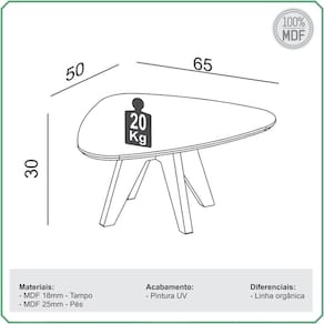 Tampo em 100% MDF 18mm e pés MDF 25mm.