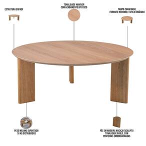 Já os pés robustos em madeira maciça de eucalipto não somente garantem estabilidade, como também trazem um ar de sofisticação ao espaço. O destaque fica para o detalhe chanfrado do tampo, que adiciona um charme especial e um toque de elegância a qualquer decoração. Perfeita para ser o centro das atenções, a mesa de centro redonda é versátil o suficiente para complementar sua sala de estar ou atuar como uma peça funcional em recepções e salas de espera.