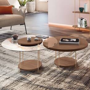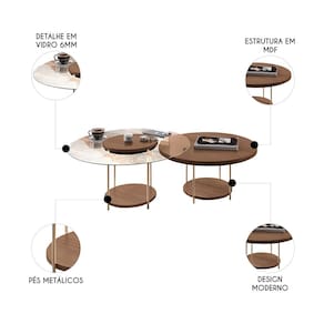 Com um design contemporâneo, as mesas apresentam tampo de MDF de 25mm e em uma das versões bordas em vidro de 6mm, criando uma composição harmoniosa entre diferentes materiais. Os pés em aço maciço 3/8, com acabamento dourado, adicionam um toque de elegância, enquanto a leveza das formas e a versatilidade da Mesa de Centro redonda permite diversas possibilidades de decoração. Ambas possuem uma prateleira inferior, um espaço extra para revistar e objetos decorativos. Ao serem usadas em conjunto, elas oferecem uma solução prática e estilosa para compor ambientes modernos e sofisticados.