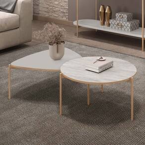 A Mesa de Centro Redonda possui tampo usinado em formato circular, com borda em pintura PU dourada. Já a Mesa de Centro Orgânica tem tampo triangular com cantos arredondados, oferecendo sofisticação ao ambiente. Ambas as mesas apresentam estrutura reforçada por pés metálicos cilíndricos dourados, proporcionando durabilidade e resistência, além de harmonizar com outros elementos decorativos. São fáceis de limpar, seguem as tendências de decoração mais atuais e são perfeitas para transformar sua Sala de Estar com estilo e funcionalidade. Com esses móveis, seu espaço ficará ainda mais bonito e aconchegante.