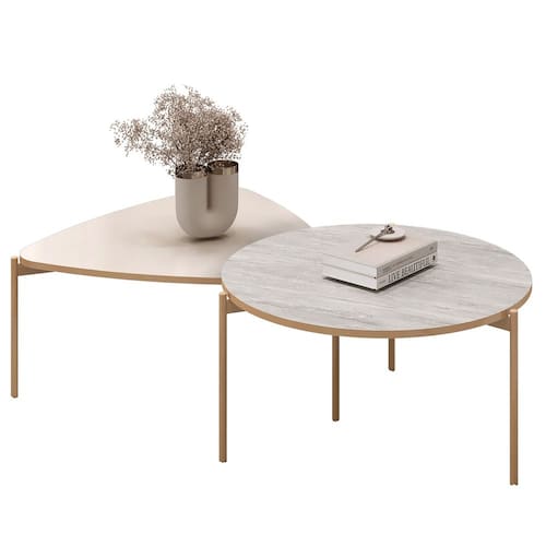 A Mesa de Centro Redonda possui tampo usinado em formato circular, com borda em pintura PU dourada. Já a Mesa de Centro Orgânica tem tampo triangular com cantos arredondados, oferecendo sofisticação ao ambiente. Ambas as mesas apresentam estrutura reforçada por pés metálicos cilíndricos dourados, proporcionando durabilidade e resistência, além de harmonizar com outros elementos decorativos. São fáceis de limpar, seguem as tendências de decoração mais atuais e são perfeitas para transformar sua Sala de Estar com estilo e funcionalidade. Com esses móveis, seu espaço ficará ainda mais bonito e aconchegante.