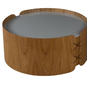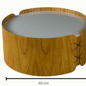 A estrutura é feita de MDF e vidro em off white, criando um formato que lembra um tambor. O acabamento em verniz.