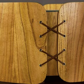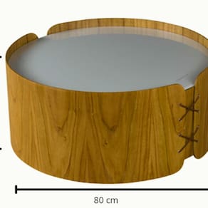 A estrutura é feita de MDF e vidro em off white, criando um formato que lembra um tambor. O acabamento em verniz.