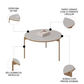 Características do Produto Material da Estrutura: MDF. Espessura das Chapas: 15mm. Peso Suportado: 4 Kg Distribuídos. Acabamento: Pintura UV. Escala de Brilho: Brilho. Possui Gavetas: Não. Possui Prateleiras: Não. Possui Nicho: Não. Possui Pés: Sim. Tipo de Pés: Metal. Diferenciais: - Design moderno. - Tampo usinado com formato circular. - Pés metálicos cilíndricos. - Borda com pintura PU na cor dourada. Sistema de Montagem: Cavilhas/Parafusos/Minifix. Manual de Montagem: Sim. Complexidade da Montagem: Média. Volumes: 2 Volumes. Conteúdo da Embalagem: 1 Mesa de Centro. Garantia do Fabricante: 90 dias contra defeito de fabricação. Montagem: Recomendamos que seja feita por um profissional. Recomendação de Limpeza: Utilize pano úmido.