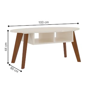 Feito em MDF/MDP 15mm. Possui 2 nichos para objetos e tampo oval de MDF.