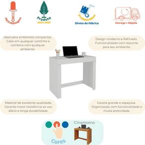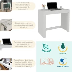 A Escrivaninha combina simplicidade e funcionalidade com um design moderno, ideal para pequenos espaços. Sua estrutura retangular em MDP com pintura UV se adapta facilmente a qualquer ambiente, oferecendo uma solução prática e elegante para o escritório. Com uma gaveta ampla e corrediça telescópica, proporciona acesso fácil e organizado aos seus objetos e documentos, trazendo um toque sofisticado e minimalista ao seu espaço e tornando o dia a dia mais eficiente.