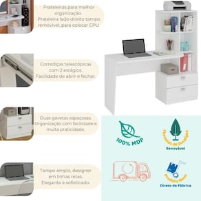 A Escrivaninha combina design moderno e funcionalidade, sendo ideal para escritórios e home offices. Fabricada em MDP com pintura UV, possui tampo robusto de 2,5 cm com cantos arredondados que garantem segurança e sofisticação. Conta com estante lateral com nichos e prateleiras incluindo uma removível para objetos maiores e prateleira superior no mesmo estilo elegante. Suas duas gavetas com corrediças telescópica oferecem armazenamento prático, enquanto o espaço inferior permite o encaixe total de uma cadeira, otimizando ambientes compactos. As laterais chanfradas complementam o visual leve e sofisticado da peça.