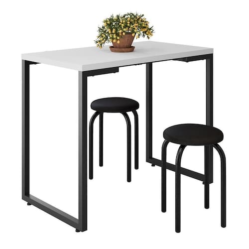 Esse kit é essencial e você vai se encantar com a praticidade. Conheça a Mesa de Cozinha Bistrô Porto Branco 90cm com 2 Banquetas Industriais Maviê Preto, da Mpozenato!