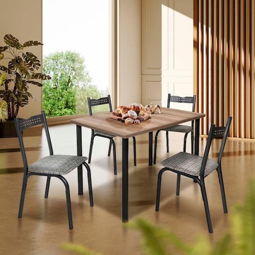 Este conjunto inclui uma mesa e quatro cadeiras, todos com estrutura e pés em aço carbono High-Steel, garantindo resistência e proteção contra ferrugem. As cadeiras possuem assentos de madeira com revestimento em corino sintético e sapatas nos pés para proteger tanto o produto quanto o piso de riscos, suportando até 100 kg cada. A mesa apresenta tampo em MDP BP, ideal para refeições em família ou encontros sociais.