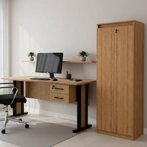 O conjunto ME4193XAM3110 traz estilo e modernidade para completar seu escritório, sendo fabricado com estrutura em madeira MDP de 15 mm, tampo em MDP de 25 mm e revestimento em material BP, com acabamento traseiro no mesmo padrão de cor e material, a Mesa para Escritório ME4193 conta com 02 gavetas que suportam até 3 kg cada, sendo uma delas com trava por chave, puxadores em metal e corrediças telescópicas, além de pés em madeira MDP de 25 mm com sapatas reguláveis, suportando até 21 kg, o Armário Multiuso AM3110 conta com duas portas, sendo uma delas equipada com trava por chave, dobradiças metálicas, sapatas e 04 prateleiras que suportam até 4 kg cada, além de amplo espaço interno que contribui para manter tudo organizado. NÃO ACOMPANHA CADEIRA NEM DEMAIS DECORAÇÕES. Este produto será entregue em 2 volumes.