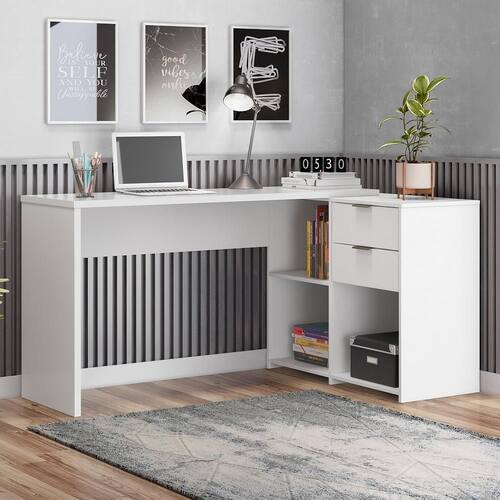 A Mesa de Escritório 2 Gavetas Xangai da Notável Móveis um móvel completo que vai te auxiliar nas atividades do home office ou estudos. Com ela, você tem diversas possibilidades de montagem: de canto, montada reta, com o nicho para o lado direito ou esquerdo e você também pode escolher em que lado colocar as gavetas!