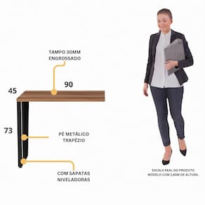 Diferenciais: - Produzida em MDP proveniente de reflorestamento: durável e ecologicamente correta. - Acabamento em BP: superfície sofisticada e fácil de limpar. - Auxiliar: esta mesa serve de complemento para ser montada na lateral da escrivaninha. - Tampo de 30mm: resistente, suporta até 25kg para apoiar materiais de trabalho e eletrônicos. - Pés metálicos em formato trapézio: oferecem um visual moderno e estabilidade. - Sapatas niveladoras: protegem o móvel, evitando o atrito com o chão.