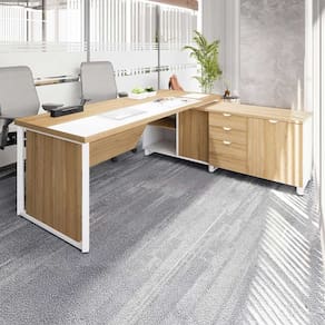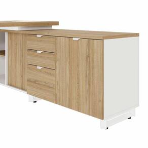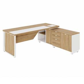 Altura: 66 cm Produto Montado: Sim Acabamento do Tampo: BP Melamínico Acabamento dos Pés: Pintura Acompanha Manual de Instalação: Sim Ambiente Principal: Escritório codigo_ean: 7900288251916 Complexidade da Montagem: Média: pode ser montado por mais de uma pessoa e/ou necessite de maior conhecimento para montagem Cor: Macadâmia/Branco Cor da Base: Marrom Cor do Produto: Macadâmia/Branco Cor do Tampo: Marrom Cor Flex: Não Cor Interna: Marrom Escala de Brilho: Fosco Espessura do Tampo: 40 mm Formato: Em L Gaveta com Chave: Não Itens Inclusos: 1 Escrivaninha, 1 Armário Lateral, Kit Ferragens e Manual da Montagem. Lado de Montagem: Direito Largura do Segundo Lado: 176,5 cm Linha ou Coleção: Corporate Manual de Montagem e Instalação: https://product-hub-prd.madeiramadeira.com.br/456362480/documents/1ce99398-a5c7-492d-89fa-42c0adb3b6cb3260869659517597482847955.pdf Marca: F5 Office Material do Puxador da Gaveta: Metal Material do Puxador da Porta: Metal Material do Tampo: MDP Material dos Pés: Metal Material Principal: MDP Montagem Flex: Não, o produto só pode ser montado conforme a imagem. Necessita Montagem: Sim Origem do Produto: Nacional Pés com Regulagem de Altura: Sim Pés Reguláveis: Sim Peso: 140,85 kg Peso Máximo por Gaveta: 15 kg Peso Máximo por Prateleira: 10 kg Posição da Gaveta: Lateral Possui Acabamento na Parte de Trás: Sim Possui Borda Arredondada: Sim Possui Caixa de Tomada: Sim Possui Gaveta para Pasta Suspensa: Sim Possui Passa Cabos: 01 Possui Porta Objetos: Sim Possui Prateleiras: Sim Quantidade de Gavetas: 03 Gavetas Quantidade de Nichos: 02 Quantidade de Prateleiras: 02 Prateleiras Recomendações de Uso, Manutenção e Limpeza: Para uma limpeza mais efetiva, utilizar apenas pano macio e sabão neutro. Não utilizar produtos abrasivos. Sapatas Niveladoras: Sim Sistema de Montagem: Parafusos e buchas metálicas. Suporta Até (kg): 80 kg Tipo de Corrediça da Gaveta: Metálica Telescópica Tipo de Dobradiça/Corrediça da Porta: Metálica Marca: Não Informado