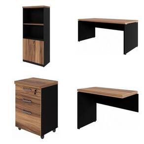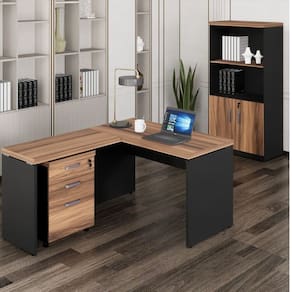 Conjunto de mesa em L, com gaveteiro e armário estante, especial para você que procura um ambiente moderno, e de muita qualidade. Produzido com Tampo confeccionado em chapa de média densidade MDP (Médium Density Particleboard) com partículas selecionadas de madeira de reflorestamento, aglutinadas e consolidadas com resina sintética e termo estabilizadas sob pressão, com 40mm de espessura, revestido em ambas as faces com filme termo prensado melamínico, com espessura mínima de 0,2mm (BP). O mesmo é produzido com sistema de engrossuramento com pinos em aço zincado 35 mm (compr.) x 1 mm (esp.) para fixação das travessas.