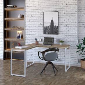 Mesa de Escritório em L Estilo Industrial 135x150cm Kuadra Carvalho / Est.Branca - Marrom