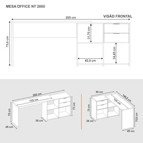 A Mesa Office NT 2060 da Notável Móveis, é um móvel completo que vai te auxiliar nas atividades do home office ou estudos. Com ela, você tem diversas possibilidades de montagem: de canto, montada reta, com o nicho para o lado direito ou esquerdo e você também pode escolher em que lado colocar as gavetas! O tampo de 25 mm é super espaçoso para você organizar itens essenciais ao dia a dia, e as gavetas possuem corrediças metálicas para guardar documentos e demais objetos. Um móvel moderno que vai atender as suas necessidades!