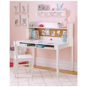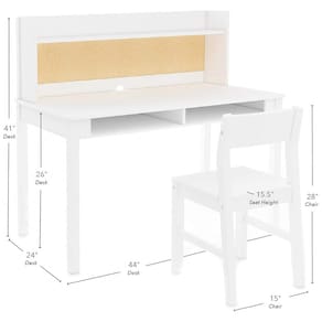 A mesa de estudo infantil Martha Stewart por Guidecraft é um conjunto completo de mobiliário em madeira de bétula combinada com engineered wood, apresentando acabamento branco creme resistente e bordas arredondadas para máxima segurança estrutural. O design inclui superfície de trabalho ampla, nichos de armazenamento aberto, recortes para cabos e tampa de cortiça na parte superior do armário, otimizando organização de materiais escolares e acessórios.