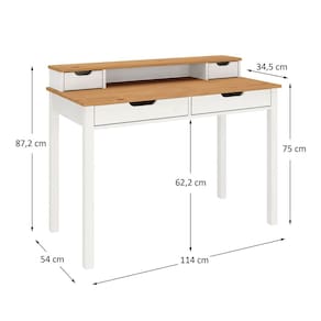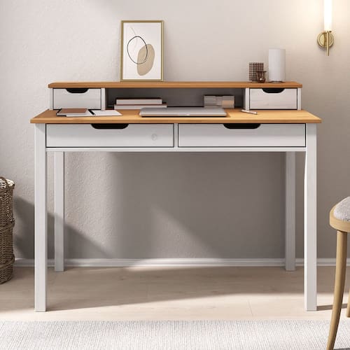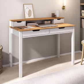 A Escrivaninha Organizadora Compacta de Madeira Maciça Raul no módulo superior possui dois nichos abertos e duas gavetas menores, perfeitas para manter itens essenciais sempre à mão. Além disso, a estrutura com fundo em MDF permite que a peça seja posicionada encostada na parede, garantindo praticidade e otimização do espaço.