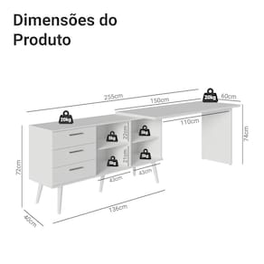 Reta: 74 cm de altura x 255 cm de largura x 60 cm de profundidade total.