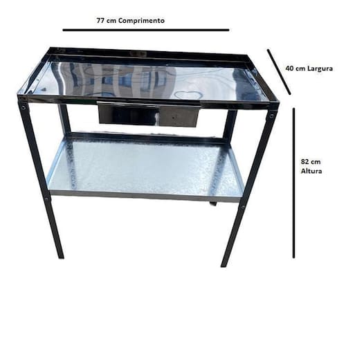 - mesa para cortar frango em aço inox com gaveta e bandejas removíveis. - dimensão 77 cm c x 40 cm l x 82 cm a -reforçada com parafusos, que vão enviados juntos das peças.