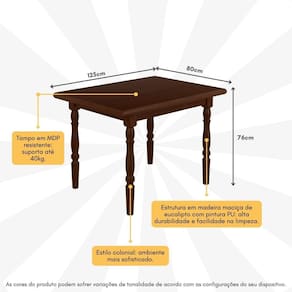 Aproveite momentos especiais à mesa com a Mesa de Jantar 125cm Multimóveis CR20277. Sua estrutura em madeira maciça de eucalipto garante durabilidade e resistência, enquanto o tampo em MDP suporta até 40kg e oferece espaço para até 4 lugares. O acabamento em pintura PU proporciona facilidade na limpeza do móvel, tornando-a uma opção prática para o dia a dia. O estilo colonial agrega charme e elegância, tornando o ambiente mais acolhedor e convidativo.