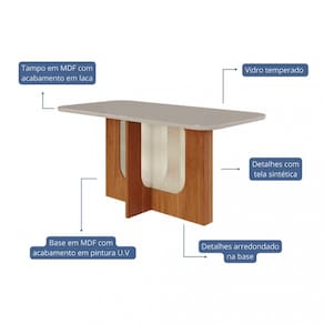 Características: Acabamento em pintura U.V. Base em MDF com tela sintética Estrutura em MDF Detalhes arredondado na base Tampo em MDF com acabamento em laca Vidro temperado