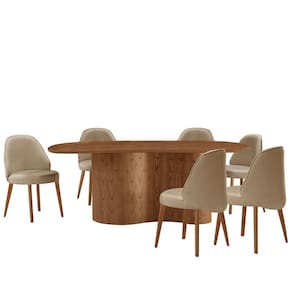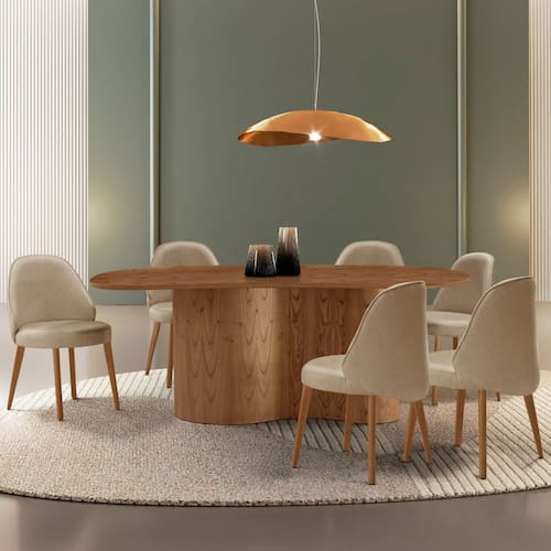 Inspirada pela grandiosidade dos Alpes, a Sala de Jantar Ester combina a imponência da natureza com a sofisticação do design. A mesa, com base orgânica esculpida, remete às montanhas, enquanto o tampo em madeira nobre traz beleza e robustez. As cadeiras, com curvas suaves e tecidos sofisticados, oferecem conforto excepcional, abraçando o corpo com elegância. Cada detalhe é pensado para criar uma atmosfera acolhedora e luxuosa, proporcionando uma experiência sensorial que transporta você para o coração dos Alpes, onde a serenidade e a beleza se encontram. Medida da Mesa (A x L x P): 80 x 180 x 90 Peso da Mesa: 82,2 kg Mesa suporta até: 40 kg Acabamento da Cadeira/Banco: Verniz Natural Acabamento da Mesa: Verniz Acompanha Manual de Instalação: Sim Almofada do assento: Fixa Almofada do encosto: Fixa Ambiente Principal: Sala de Jantar Cadeira/Banco Estofada: Encosto e Assento Estofados Cadeira/Banco estofada: Encosto e Assento Estofados Cadeira/Banco suporta até: 150 kg codigo_ean: 7900288189752 Complexidade da Montagem: Média: pode ser montado por mais de uma pessoa e/ou necessite de maior conhecimento para montagem Configuração do Conjunto: Mesa com Cadeiras Cor: Turim / Imbuia Natural Cor do Produto: Turim / Imbuia Natural Cor Flex: Não Cor Secundária: Bege De Canto (Canto Alemão): Não Design da Base: Em U Enchimento do Assento: Espuma D-26 Escala de Brilho: Semi-Fosco Espessura do Tampo: 40 mm Estrutura do Assento: Madeira Formato do Tampo: Oval Informações Complementares: As cadeiras são entregues totalmente montadas, prontas para uso. Itens Inclusos: 1 Mesa de Jantar, 6 Cadeiras, Manual de Montagem e Kit Ferragem Linha ou Coleção: Ester Manual de Montagem e Instalação: https://product-hub-prd.madeiramadeira.com.br/309204350/documents/730e85bc-ff7b-458a-9def-3521fd94fdcf3053574584417518853106408.pdf Marca: Mobilare Material da Base da Mesa: MDF Laminado/Madeira Maciça Material da Estrutura da Cadeira: Madeira Material do Tampo: Laminado Material Principal: Madeira Material Principal das Cadeiras/Bancos: Madeira Maciça Medida da Cadeira/Banco (A x L x P): 90 x 54 x 51 Medida do Tampo (L x C x E): 180 x 90 x 4 Mesa Dobrável: Não Mesa Extensível: Não Montagem Flex: Não Necessita Montagem: Sim Origem do Produto: Nacional Peso da Cadeira/Banco: 7,1 kg Possui Apoio para Braços: Não Possui Apoio Para os Pés: Não Possui Prateleiras: Não Possui Suporte Giratório: Não Possui Vidro: Não Quantidade de Cadeiras: 6 Quantidade de Lugares: 06 Recomendações de Uso, Manutenção e Limpeza: Limpar com pano seco. Revestimento da Cadeira/Banco: Linho Sistema de Montagem: Parafusos Tipo de Assento: Fixo Tipo de Encosto: Estofado
