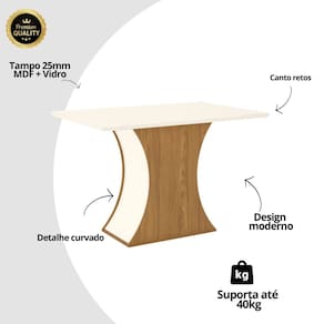 Com tampo de 120cm em MDF e vidro na cor Nature/Off White, ela acomoda até 4 pessoas com conforto e estilo, ideal para apartamentos ou salas de jantar menores.