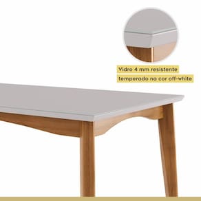 Elegância e resistência para sua sala de jantar! Produzida 100% em madeira maciça de eucalipto, com tampo em MDF laqueado Off White e vidro temperado serigrafado colado. Estrutura robusta com acabamento fosco e design moderno com 4 pés.