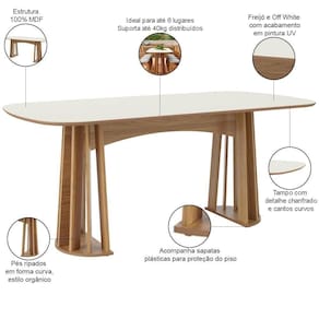 Altura: 78 cm | Ambiente recomendado: Sala de Jantar | Capacidade máxima de pessoas: 6 lugares | Color: OFF WHITE | ColorFamily: Off White | ColorSimple: Off White | ColorSupplier: Off White Freijó | Cor: Off White Freijó | Cor dos pés: Freijó | É personalizado: Não | Estilo: Orgânico | Forma: Retangular | Largura: 180 cm | Material: MDF | MaterialFamily: MDF | Model: Dalí | OriginCountry: | OriginState: PR | Peso: 33 Kg | ProductContents: 01 Mesa de Jantar | ProductHeight: 78 cm | ProductInstructions: Produto para uso em ambiente interno, nao devendo ficar exposto ao sol, calor e umidade excessivos. | ProductLength: 90 cm | ProductWarranty: 90 dias após o do produto | ProductWeight: 33 kg | ProductWidth: 180 cm | Quantidade de Caixas de embalagem: 2 | Requer montagem: Sim | SizeDescription: Altura: 78 cm x Largura: 180 cm x Profundidade: 90 cm | SupplierSimpleName: Mesa De Jantar 6 Lugares Pés Ripado Orgânico 180cm Dalí Off White Freijó - Lyam Decor