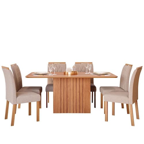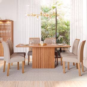 Mesa de Jantar Ana 180x90 com Tampo em MDF e 6 Cadeiras Juliana Wood - Cimol Móveis O Conjunto Mesa de Jantar Ana 180x90 com 6 Cadeiras Juliana Wood une sofisticação e conforto para compor sua sala de jantar. A mesa possui estrutura em MDF com pintura UV, tampo de 25mm com bordas chanfradas e acabamento em laca, além de uma base ripada com fixação oculta para um visual moderno. Já as cadeiras Juliana Wood são fabricadas em Madeira Tauari com acabamento em verniz, revestimento em tecido e espuma de alta densidade, proporcionando elegância e aconchego. Ideal para acomodar 6 pessoas com estilo e qualidade.
