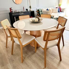 Apresentamos a Mesa de Jantar Araçá, uma peça elegante e versátil que será o ponto central de refeições compartilhadas entre familiares e amigos, seja na sala de jantar, na cozinha ou em ambientes comerciais. Com um design contemporâneo e acabamento de alta qualidade, esta mesa oferece praticidade e estilo para diversos espaços. Acabamento: Laca Acabamento da Base: Verniz Acabamento do Tampo: Laca Ambiente Principal: Sala de Jantar Atóxico: Não codigo_ean: 7909903623534 Complexidade da Montagem: Baixa: pode ser montado por uma pessoa sozinha Cor: Off-White Cor do Produto: Off-White Design da Base: Cilindro Dobrável: Não Escala de Brilho: Semi-Brilho Espessura do Tampo: 28 mm Extensível: Não Itens Inclusos: TAMPO E BASE Linha ou Coleção: Mata Atlântica Manual de Montagem e Instalação: https://product-hub-prd.madeiramadeira.com.br/896009/documents/cf14523f-b7f2-4659-9beb-7cf23db9e086ualdemontagemmesaconedocx1.pdf Material da Base: Madeira Maciça Material do Tampo: Vidro/MDF Material Principal: MDF Medida da Base (A x L x P): 75X50X50 Medida da Mesa (A x L x P): 78x100x100 Medida do Tampo (L x C x E): 100X100X0,28 Necessita Montagem: Sim Origem do Produto: Nacional Peso: 38,4 kg Possui Portas: Não Possui prateleira: Não Possui Rodízio: Não Possui Suporte Giratório: Não Possui Vidro: Sim Recomendações de Uso, Manutenção e Limpeza: Limpeza: Utilize pano levemente úmido em seguida pano seco. Nunca use solventes, objetos cortantes ou abrasivos. Sistema de Montagem: Coloque o tampo de vidro em cima da base, centralizado. Parafuse de baixo para cima nos pontos indicados. Suporta Até (kg): 40 kg Tipo de Madeira Maciça da Base: Eucalipto