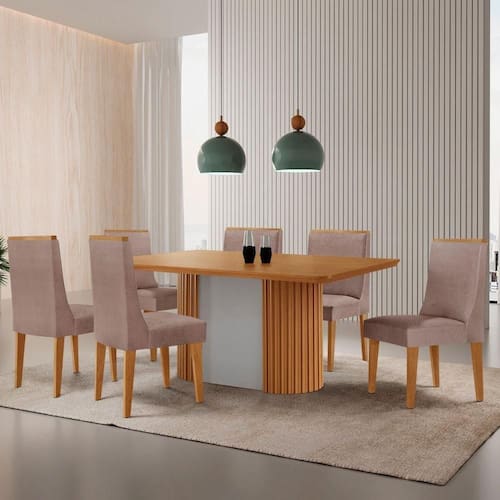 O Conjunto combina design moderno, sofisticacao e funcionalidade. A Mesa Aspen traz um visual imponente, com tampo em MDF e canto copo, destacando-se pela base ripada em MDF, que adiciona textura e personalidade ao ambiente. Perfeita para quem busca um estilo clean e atual, ela transforma qualquer espaco com leveza e elegancia.