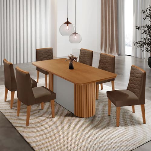 A mesa se destaca com sua base com detalhes ripados, que adiciona um toque único, enquanto as cadeiras, totalmente estofadas e com bordados, oferecem conforto e estilo. As alças proporcionam um visual moderno e diferenciado. Inspirado nas montanhas de Aspen, este conjunto é ideal para criar um ambiente acolhedor e convidativo em sua casa. Não perca a chance de transformar sua sala de jantar!