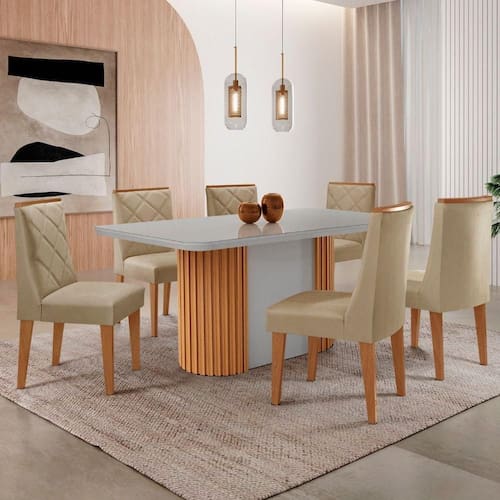 O Conjunto combina design moderno, sofisticacao e funcionalidade. A Mesa Aspen traz um visual imponente, com tampo em MDF e Vidro, destacando-se pela base ripada em MDF, que adiciona textura e personalidade ao ambiente. Perfeita para quem busca um estilo clean e atual, ela transforma qualquer espaco com leveza e elegancia.