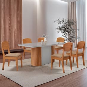 O Conjunto Mesa Aspen e Cadeira Copper é a escolha ideal para quem busca aliar sofisticação, conforto e design contemporâneo. A Mesa Aspen impressiona com seu tampo em MDF e Vidro canto copo, além da base ripada em MDF que confere textura e personalidade.