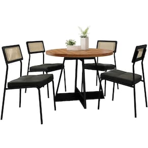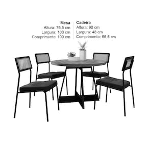 Mesa de Jantar Atria Redonda com 4 Cadeiras Lux Carraro A Mesa de Jantar Atria Redonda com 4 Cadeiras Lux Carraro é a combinação ideal de elegância e funcionalidade para sua sala de jantar. Com design moderno e sofisticado, a mesa redonda incentiva a proximidade e a conversa, tornando cada refeição um momento especial. A estrutura, feita com tubos de aço e travessas de MDF, garante estabilidade e durabilidade, enquanto o tampo em MDP BP de 40mm oferece resistência superior a riscos e desgastes do dia a dia. As cadeiras Lux complementam perfeitamente o conjunto. O assento estofado proporciona um toque de luxo e conforto. O encosto em MDF com tela sintética traz leveza e um visual diferenciado, enquanto a estrutura tubular de aço confere resistência e segurança. Para a sua tranquilidade, as sapatas antirrisco e antirruído nas bases da mesa e das cadeiras protegem o piso de danos, garantindo uma experiência completa e sem preocupações. Adquira agora a Mesa de Jantar Atria Redonda com 4 Cadeiras Lux Carraro na Estrela Móveis e transforme sua sala de jantar com estilo e qualidade.\nMEDIDAS\nAltura (Mesa) 76,5 cm\nComprimento (Mesa) 100 cm\nLargura (Mesa) 100 cm\nAltura (Cadeira) 90 cm\nComprimento (Cadeira) 56,5 cm\nLargura (Cadeira) 48 cm\nCARACTERÍSTICAS\nFabricante Carraro\nModelo Mesa de Jantar Atria Redonda\nGarantia 3 meses\nTipo de Produto Mesa de Jantar\nAmbiente Sala de Jantar\nEstrutura Mix de tubos de aço e travessas de MDF, Tampo em MDP BP (resistência a riscos) de 40 mm\nTecido Revestimento Corino\nPossui Vidro Não\nEstilo Moderno\nAcabamento Pintura Epóxi\nNecessita Montagem Sim\nAcompanha Manual de Instalação Sim\nINFORMAÇÕES IMPORTANTES\nObjetos decorativos que porventura apareçam na foto, não acompanham o produto. Não nos responsabilizamos pela montagem/instalação dos produtos.\nMontagens, desmontagens e instalações são responsabilidades do cliente. Indicamos que contrate uma empresa de montagem ou um montador de sua confiança.\nAlém disso, favor verificar se os pés e acessórios estão dentro do forro inferior do produto. Em suma, todas as informações divulgadas sobre o produto são de responsabilidade do Fabricante.\nAs cores do produto podem variar de acordo com o seu monitor, a iluminação do ambiente em que você está e até mesmo a sua percepção visual. Além da cor, pequenos detalhes e acabamentos podem não ficar evidentes na foto, por isso as imagens são meramente ilustrativas.