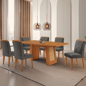 Para complementar com estilo e conforto, as Cadeiras Melissa sao a escolha ideal. Com assentos e encostos estofados, elas proporcionam um conforto excepcional mesmo durante longos periodos de uso. O toque final fica por conta dos bordados no encosto, um detalhe especial que traz charme e sofisticacao ao conjunto.