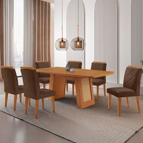 Mesa De Jantar Carolina Com 6 Cadeiras Moderna Mobilia Veludo Marrom/naturalle Laminado O conjunto formado pela Cadeira Melissa e a Mesa Carolina e a combinacao perfeita de sofisticacao, conforto e design contemporaneo. A Mesa Carolina, com tampo laminado de 180 cm, complementa o conjunto com estilo e praticidade. Seu diferencial esta na base com detalhes que imitam rattan, adicionando um toque natural e elegante ao ambiente.