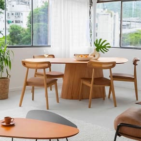 A superfície oval proporciona um espaço funcional e confortável para refeições, sendo ideal para ambientes de jantar que buscam aliar estilo e praticidade. O acabamento em madeira freijó realça a beleza natural do material, conferindo à mesa uma aparência quente e acolhedora. Além disso, suas linhas orgânicas e suaves promovem uma sensação de fluidez e dinamismo no ambiente, tornando-a uma peça central em qualquer sala de jantar.