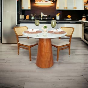 Nossa Mesa de Jantar Cone é uma mesa 4 lugares, tem um Acabamento de Alto Nível com uma lamina de madeira Cinamomo em sua Base para deixar sua Sala de Jantar com aquele charme. Uma mesa redonda, versátio e moderna vai fazer toda diferença no seu ambiente! FOTO REAL do produto, tirada em nosso estúdio. MEDIDAS Altura: 79 cm Diâmetro: 90 cm Cor: Vidro Branco Cor tampo: Branco Cone: Madeira Lamina de Cinamomo DIFERENCIAL Mesa Redonda Laca PU fosca Selo de Qualidade Casa Uai Cone com lamina de Cinamomo Verniz na base em alta resistência Vidro fixo para maior segurança Vidro Serigrafado com 7 camadas de laca Off White Base em Madeira tratada e seca em estufa e Sustentável Acabamento nos pés em Verniz alta resistência MONTAGEM Gral de facilidade : 01 ( Super fácil ) Acabamento: Verniz Acabamento da Base: Verniz Acabamento do Tampo: Verniz Ambiente Principal: Sala de Jantar codigo_ean: 7909903306444 Complexidade da Montagem: Baixa: pode ser montado por uma pessoa sozinha Cor: Branco Cor do Produto: Branco Design da Base: Cilindro Escala de Brilho: Fosco Espessura do Tampo: 18 mm Extensível: Não Itens Inclusos: 1 Mesa, Kit Ferragens e Manual de Montagem Linha ou Coleção: Cairo Manual de Montagem e Instalação: https://product-hub-prd.madeiramadeira.com.br/849973/documents/b01602bd-0f30-4140-bd7b-6cc1335b9080164manualmontagemmesacairo.pdf Material da Base: Madeira Maciça Material do Tampo: MDF Material Principal: Madeira Maciça Medida da Base (A x L x P): 76x46x46 Medida da Mesa (A x L x P): 79x90x90 Medida do Tampo (L x C x E): 90x90x78 Necessita Montagem: Sim Origem do Produto: Nacional Peso: 21 kg Possui Rodízio: Não Possui Vidro: Sim Recomendações de Uso, Manutenção e Limpeza: Pano umedecido para limpeza Sistema de Montagem: Chave de Fenda Suporta Até (kg): 50 kg Tipo de Madeira Maciça: Eucalipto Tipo de Madeira Maciça da Base: Eucalipto Marca: Casa Uai