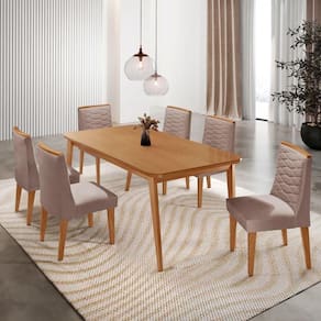 Mesa De Jantar Copper 180cm Tampo Mdf Com 6 Cadeiras Eloise Linho Capuccino// Conjunto Sala de Jantar Mesa Copper e Cadeira Eloise A Mesa Copper e uma peca que traz elegancia e sofisticacao para qualquer ambiente. Sua base em madeira oferece uma estrutura resistente e duravel, enquanto o tampo em MDF e acabamento canto copo garante um visual refinado. Com design sofisticado e estrutura solida, ela complementa o ambiente com um toque natural e acolhedor.
