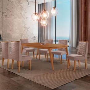 Mesa De Jantar Copper 180cm Tampo Mdf Com 6 Cadeiras Moderna Linho Capuccino// Sala de Jantar Copper com Cadeira Andes A mesa Copper, com base em madeira e tampo em MDF, irradia elegancia e sofisticacao. Seu design refinado, aliado a uma estrutura solida, faz dela uma peca imponente e duravel. Perfeita para espacos que buscam aliar estilo e conforto, essa mesa e a escolha ideal para transformar seu ambiente com classe e personalidade.