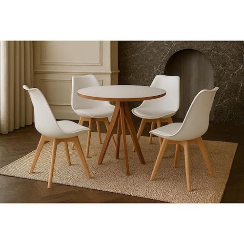 A cadeira possui assento e encosto em polipropileno resistente na cor branca, com formato ergonômico que garante conforto no dia a dia. Os pés em madeira natural oferecem robustez e elegância, harmonizando perfeitamente com diferentes estilos de decoração, do clássico ao contemporâneo.