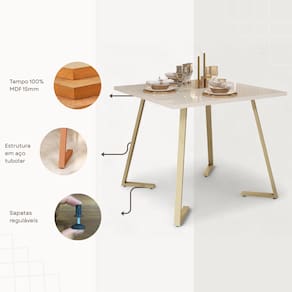Características: - Medidas: 80 cm (largura) x 80 cm (profundidade) x 74cm (altura); - Tubo pés 40x20x0,90; - Sapata Regulável; - Ponteiras polietilenos; - Pintura eletrostática; - Pintura UV; - Borda nos 4 lados; - Capacidade: 4 lugares; - Estilo: Industrial; - Tampo resistente e fácil de limpar; - Estrutura em aço pintado, com alta durabilidade; - Ideal para ambientes compactos e modernos.