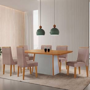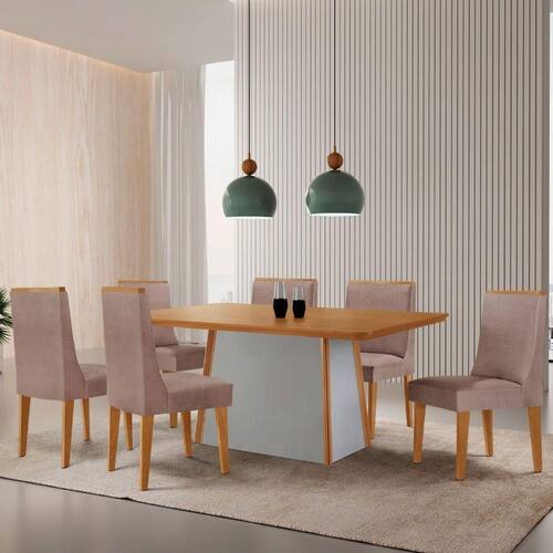 A Mesa Diane, produzida em 100 MDF com Tampo Canto Copo, e a escolha ideal para transformar refeicoes em experiencias memoraveis. Seu design elegante combina perfeitamente estilo e resistencia, garantindo durabilidade sem abrir mao da estetica. A base robusta, com extremidades em acabamento Naturalle, e um verdadeiro destaque visual, agregando charme e sofisticacao ao ambiente. As Cadeiras Lisboa completam o conjunto com conforto e praticidade. Totalmente estofadas, proporcionam uma experiencia agradavel ao sentar, enquanto suas alcas facilitam o manuseio no dia a dia, tornando o ambiente ainda mais funcional.