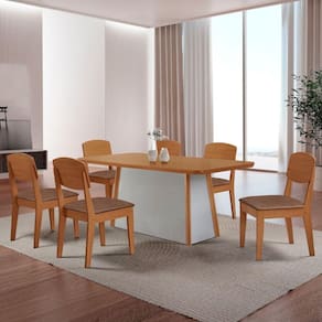 A cadeira Copper, com encosto em MDF e Assento Estofado, oferece Conforto e suporte ideais. O conjunto e uma escolha que agrega sofisticacao e praticidade a qualquer ambiente.