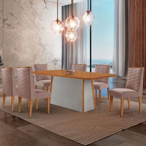 A Mesa Diane, produzida em 100 MDF com tampo canto copo, é a escolha ideal para transformar refeições em experiências memoráveis. Seu design elegante combina perfeitamente estilo e resistência, garantindo durabilidade sem abrir mão da estética. A base robusta, com extremidades em acabamento Naturalle, é um verdadeiro destaque visual, agregando charme e sofisticação ao ambiente. As Cadeiras Safira são totalmente estofadas, oferecendo conforto e um toque de charme com seus elegantes bordados na parte frontal e traseira. Os detalhes sofisticados valorizam ainda mais seu visual, tornando-a perfeita para ambientes modernos e elegantes. As alças facilitam o manuseio, tornando o dia a dia mais prático ao movimentar as cadeiras.