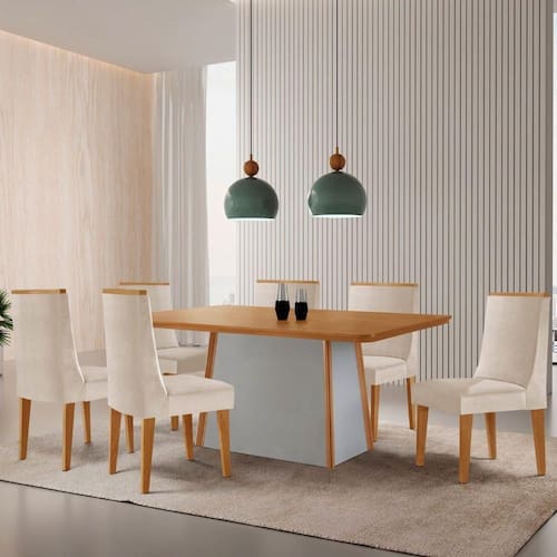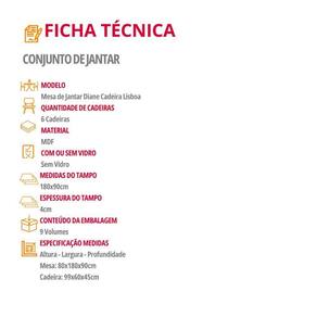 A Mesa Diane, produzida em 100 MDF com Tampo Canto Copo, e a escolha ideal para transformar refeicoes em experiencias memoraveis. Seu design elegante combina perfeitamente estilo e resistencia, garantindo durabilidade sem abrir mao da estetica. A base robusta, com extremidades em acabamento Naturalle, e um verdadeiro destaque visual, agregando charme e sofisticacao ao ambiente. As Cadeiras Lisboa completam o conjunto com conforto e praticidade. Totalmente estofadas, proporcionam uma experiencia agradavel ao sentar, enquanto suas alcas facilitam o manuseio no dia a dia, tornando o ambiente ainda mais funcional.