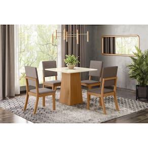 Mesa de Jantar 04 Lugares Dora 900 mm: Tampo quadrado em MDF 25 mm com pintura especial, a fim de garantir mais durabilidade ao produto; Tampo canto reto sem vidro. Cadeira Milla: Densidade da espuma do Assento: D18. Densidade da espuma do Encosto: D18. Medidas; Mesa: A: 800 x L: 900 x P: 900 mm Cadeira: A: 945 x L: 415 x P: 535 mm Grantia: 90 dias. Recomendação de limpeza: Usa pano levemente umedecido com água, seguido por pano seco. Evitar exposição ao sol, para aumentar a durabilidade da cor do tecido. Não usar escova e/ou produtos abrasivos. Montagem: Montagem, desmontagem e outras instalações serão de responsabilidade do cliente. Não nos responsabilizamos, no ato da entrega, por subir escadas/elevadores ou pelo transporte por guincho em apartamentos. Eventuais despesas são de responsabilidade do comprador; Observações importantes: A tonalidade da cor do produto pode variar de acordo com a sua tela, a iluminação do ambiente ou sua percepção visual Lembrando que são fotos ilustrativas tratadas em estúdios podendo haver pequena diferença nas cores A montagem será de responsabilidade do comprador; Não nos responsabilizamos, no ato da entrega, por subir escadas/elevadores ou transporte por guincho em apartamentos. Eventuais despesas são de responsabilidade do comprador; Confira as dimensões deste produto e certifique-se de que passará normalmente por supostos elevadores, portas, escadas e/ou corredores de sua residência; Para mais informações, acesse nossa Central de Atendimento. Marca: LM DECOR